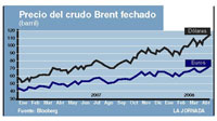 Aunque la parte de la demanda no pueda explicar la duplicación de precios del petróleo en términos de dólar, y el fuerte impacto sobre otros precios de energía, el dólar a la baja y la especulación también son parte del problema. La situación del dólar influye en que los precios de petróleo hayan aumentado más en términos de dólares que de euros el año pasado (ver gráfica).