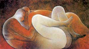 Permítaseme una anécdota personal. Un par de tardes, en 2005, Miguel Ángel Muñoz me pidió acompañarlo a casa de Ricardo Martínez. Luego de horas de conversación literaria y musical (Martínez es quizá el pintor mexicano con más lecturas literarias y con más gusto por la música) nos mostró una serie de sus grandes telas. Una y otra vez no dejaba de asombrarme la manera de crear en figuras desproporcionadas una viva sensualidad. El centro del centro de su mundo es la mujer. Desde la primera vez que vi sus desnudos de mujeres me parecía que las pintaba con el pincel y el tacto : ya solas y desnudas (en posición horizontal, de lado o de pie), ya en el abrazo ansioso con el amante, ya en la cópula abrasadora. La mujer es creada en una desnudez del primer instante del mundo con líneas ligera o largamente curvadas. En su aparente inmovilidad las figuras, gracias a los juegos vivos de las líneas, de los innumerables matices del color y de las vibraciones destellantes de la luz, tienen un ritmo secretamente incesante. “Y hay qué decir –escribió Bonifaz Nuño– que muy pocas veces la mujer ha sido figurada con majestad tan alta.” Y a su vez Alí Chumacero dice sobre la mujer en la pintura de Martínez: “La majestad de la presencia, cercana al tacto y sobre todo a la mirada, es un resumen de las fuerzas y de la armonía preestablecidas en la naturaleza.”