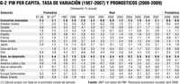 En los países avanzados, el PIB por habitante creció en 2007 en términos reales 2.1% y se prevé que en 2008 lo hará a 0.8%; en los países en desarrollo este PIB aumentó 6.6% el año pasado y se estima bajará a 5.4% en este año (Gráfico 2).