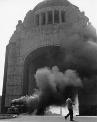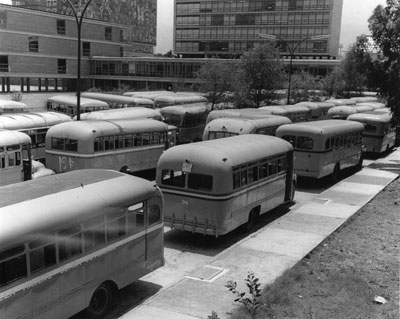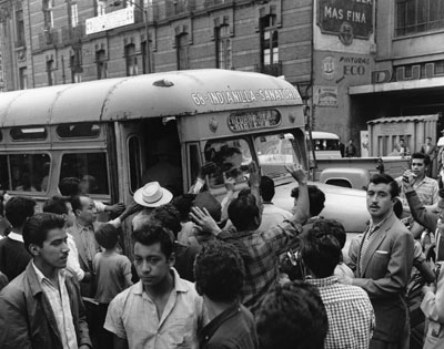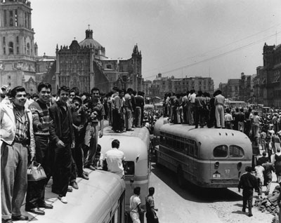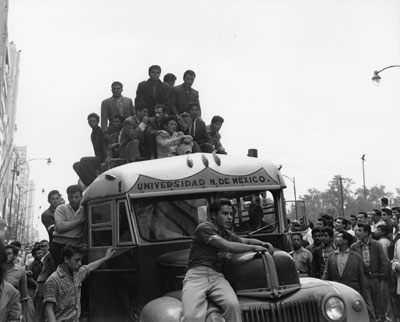 En agosto de 1958 la confluencia de situaciones, como la necesidad de los estudiantes de Derecho de la UNAM por ocupar un lugar en la sociedad de alumnos, el alza de tarifas de transporte en Monterrey y el descontento de camioneros y maestros con profundas raíces sociales dio origen a un movimiento que, aunque apenas duró dos semanas, convocó a miles de personas a diferentes mítines, la salida del Ejército a las calles y la intervención directa del entoncewidth="500"s presidente de la República, Adolfo Ruiz Cortines. La imagen muestra una de las manifestaciones de protesta típicas de esta movilización: secuestro y quema de autobuses de transporte público, en el Monumento a la Revolución |