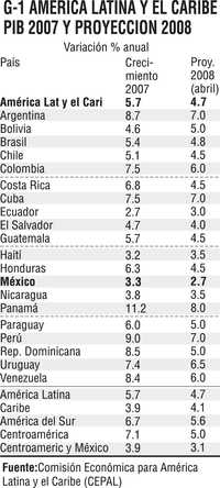 Por subregiones, la CEPAL proyecta para 2008 un creci- miento para América del Sur de 5.6%, para Centroamérica de 5.0%, para el Caribe de 4.1, y para México de 2.7 (la expecta-tiva más baja de toda la región Latinoamérica).