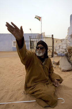 La actual nación del Sahara Occidental ha construido su identidad y su organización política, social y económica “en la intemperie del mundo”, definición que alude no sólo a las condiciones geográficas y climáticas de su territorio, sino al abandono de la comunidad internacional. Sin embargo, la obsesión entre los jóvenes de la nación consiste en conseguir una beca para estudiar en el exterior, ya sea en Cuba, España, Argelia o Libia, las cuales se otorgan desde 1977. La primera imagen, ex combatiente ciego del Frente Polisario durante la oración en el hospital para heridos de guerra en Rabuni. Sobre las líneas, zona arqueológica donde predominan pinturas rupestres, en el territorio recuperado de Tifariti, en el Sahara