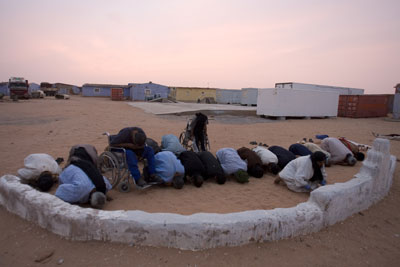 La población Tifariti, en el territrio liberado, fue declarada hace poco capital del Frente Polisario, que trabaja por la liberación de la nación saharaui: hace 17 años consiguió un acuerdo en el que Marruecos permitiría que los refugiados y las ciudades bajo su control podrían optar por su estauts de nación o como parte del gobierno de Rabat. Aunque la ONU avalaba el pacto, el gobierno marroquí no cumplió. La gráfica muestra heridos de guerra –parapléjicos, invidentes, mutilados por esquirlas o minas antipersonales–, en un momento de oración |