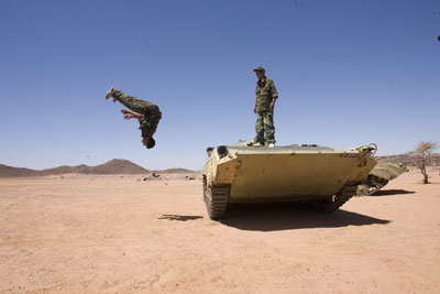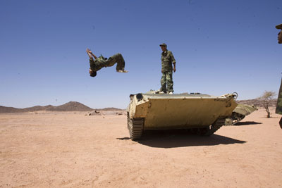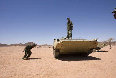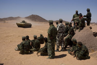 | El Aiún, es la capital del territorio ocupado por las autoridades marroquies, y donde, de manera cíclica, han surgido diversas rebeliones contra la ocupación. La serie corresponde al entrenamiento del Frente Polisario, que hoy conmemora 35 años de su creación, en el territorio recuperado de Tifariti | |