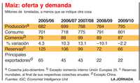 La mejor cosecha estadunidense de 2007, la mayor de todos los tiempos, 332 millones de toneladas, fue completamente absorbida por mayores exportaciones y el incremento del uso interno, sobre todo para la producción de etanol, y las reservas estadunidenses no aumentarán durante 2007/08. Aunque los precios de la planta han aumentado, los de la soya se han elevado más rápido, y se espera que algunos agricultores que cultivaron maíz en 2007 cambien a oleaginosas en 2008, sobre todo porque los costos de producción de soya son inferiores (requiere menos fertilizantes y agua). El cálculo más reciente (31 de marzo de 2008) sobre las intenciones de cultivo de los agricultores apuntaba a que la siembra maicera se reduciría en 3.1 millones de hectáreas (8%) y la soya aumentaría 4.5 millones (17%). Incluso considerando la tendencia de las cosechas –mucho mejores que en 2007–, EIU pronostica que la producción estadunidense será de 317 millones de toneladas en 2008, lo que implica una disminución de 15 millones, a consecuencia del descenso de los cultivos. Es importante resaltar que el mal clima –en especial sequía o excesivo calor, a mediados del verano– podría disminuir aún más la cosecha. Además, las crecientes necesidades domésticas limitarán la capacidad de EU para exportar maíz en 2008/09. Suponiendo que las reservas de fin de ciclo decrezcan sólo 15 millones de toneladas –quizá cerca de su mínimo nivel de seguridad–, lo más que EU podría exportar serían 50 millones de toneladas, en comparación con ventas estimadas por 62 millones de toneladas en 2007/08.