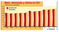 El volumen de ganado aumenta en EU, pese al temor de una recesión económica, lo cual incrementa la demanda de alimentos para animales. El crecimiento más importante se presenta en carne de aves y cerdo. Se ha calculado que, durante 2007/08, el uso del maíz como forraje alcanzará la cifra récord de 151 millones de toneladas. Es probable que los precios del grano aumenten en comparación con los del trigo y oleaginosas en 2008/09, lo que propiciaría que los consumidores de alimentos para ganado cambien a estos últimos. Se prevé que el alimento a base de maíz descienda 6 millones de toneladas. La política estadunidense promueve la producción doméstica de etanol a través de créditos fiscales a empresas mezcladoras y un impuesto sobre importaciones de etanol para combustible. 81 millones de toneladas de maíz, 30% del uso doméstico estadunidense, se destinarán a la fabricación de etanol durante 2007/08. El compromiso de Washington de elaborar combustible a partir de productos agrícolas fue reafirmado en la Ley de Independencia Energética y Seguridad de diciembre de 2007, que se marcó el objetivo de producir casi 60 mil millones de litros de etanol en 2015, lo que requerirá de 140 millones de toneladas del cereal. La mayor parte del incremento desde los actuales niveles de uso de la gramínea se daría en los próximos dos o tres años. Es posible que la producción de etanol estadunidense absorba 105 millones de toneladas de maíz en 2008/09 y 115 millones durante el periodo 2009/10, independientemente del precio. En otras palabras, en caso de una escasez del producto, el uso para ganado y las exportaciones se reducirían. EIU pronostica que el consumo maicero total estadunidense durante 2008/09 será de 286 millones de toneladas y que ascenderá a 291 millones de toneladas durante 2009/10.
