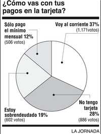 De cara a las noticias de que la creciente inestabilidad económica del país comienza a tener un reflejo en las tarjetas de crédito, hicimos un sondeo esta semana entre 3 mil 166 personas. De entrada, el 28 por ciento dijo que no tiene tarjeta. Sólo el 37 por ciento asegura que va al corriente en sus pagos. El 19 por ciento está sobrendeudado, anda en problemas con los bancos. Y un 16 por ciento se ubica en el límite: sus ingresos apenas le alcanzan para ir haciendo el abono mínimo mensual.