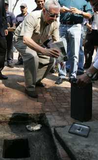 El secretario de Obras y Servicios del Gobierno del Distrito Federal, Jorge Arganis Díaz Leal, depositó en una caja de plomo, cápsula del tiempo, la portada de ayer de La Jornada, junto con las de otros tres diarios de circulación nacional en el parque Luis Pasteur, en el cruce del Paseo de la Reforma e Insurgentes. La caja sustituye otra que se encontró en el mismo sitio durante los trabajos de rehabilitación del parque, justo debajo de la escultura del padre de la microbiología, donada por la comunidad francesa en México para las fiestas del centenario de la Independencia, que contenía tres periódicos nacionales: El Diario, volumen VI, número 1403; El País y El Imparcial, del 9 y 10 de septiembre de 1910, y otros tres franceses, así como una fotografía de Porfirio Díaz, durante el acto en que se colocó la primera piedra del parque y una carta que a decir de Arganis, da cuenta de la donación de la escultura, y en la que figura el nombre de Luis Bautista Ebrard, abuelo del actual jefe de Gobierno, Marcelo Ebrard Casaubon