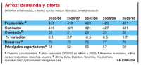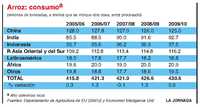 El consumo mundial de arroz durante el periodo 2007/08 se estima actualmente en 421 millones de toneladas, casi sin cambio desde el año anterior. Como el consumo tiende a crecer en alrededor de 3 millones toneladas por año, esta reducción es bastante significativa. Suponiendo que tarde o temprano los precios volverán a niveles que reflejen correctamente el balance entre reservas y uso, es probable que el consumo se eleve a 427 millones de toneladas durante 2008/09 y a 431 millones en 2009/10. En 2008 se espera que las importaciones mundiales de arroz sumen 27.9 millones de toneladas, 2.6 millones menos que en el año pasado. Pero se prevé que se recuperen para alcanzar 30 millones de toneladas tanto en 2009 como en 2010.