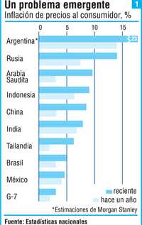 En América Latina, la inflación permanece baja en relación con su pasado ignominioso. Aun así, el índice de Brasil se ha elevado a 5%, de menos de 3% a principios del año pasado. Chile ha saltado de 2.5% a 8.3%. Más alarmantes son los casos de Venezuela, donde el índice es de 29.3%, y Argentina. Oficialmente el índice inflacionario argentino es de 8.9%, pero pocos economistas creen en esos números. Morgan Stanley estima que la cifra real es 23%, por arriba de 14.3% el año pasado.