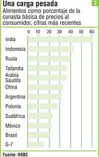El análisis de Goldman Sachs de 1990-2007 confirma que en los mercados emergentes el encarecimiento de los productos alimenticios pareció causar el alza de otros precios. En las economías más desarrolladas el nexo entre inflación alimentaria y no alimentaria fue estadísticamente insignificante. Además de la proporción mayor de los alimentos, esto tiene dos causas: la credibilidad de los bancos centrales es más débil en la mayoría de las economías emergentes, así que las expectativas inflacionarias carecen de solidez, y los salarios reales tienden a ser menos flexibles. Ambas causas aumentan el riesgo de una espiral salarios-precios.