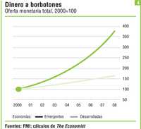 Evidentemente, la política monetaria tiene que apretarse. En cambio, se ha relajado: las tasas de interés reales son en general inferiores a las de hace un año. Las tasas a corto plazo son también excepcionalmente bajas en relación con el crecimiento del PIB nominal (una medida gruesa de lo que las tasas deberían ser), lo cual revela una política monetaria muy relajada (ver gráfica 3). La enorme oferta de dinero ha crecido en promedio 20% el año pasado en las economías emergentes, casi tres veces el ritmo del mundo desarrollado (ver gráfica 4). La oferta de dinero en Rusia aumentó 42%.