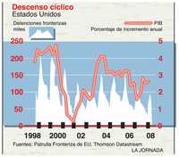 Por tercer año consecutivo, la Patrulla Fronteriza estadunidense reporta un agudo descenso de detenciones en la frontera y en sus cercanías. En 2006 la cifra cayó 8%, a cerca de un millón. El año pasado descendió una quinta parte. El semestre que concluyó en marzo mostró un descenso de 17% en comparación con el periodo similar del año anterior. En resumen (y debido al inexacto registro de las detenciones fronterizas) el flujo migratorio es hoy alrededor de la mitad del torrente presenciado en 2000, cuando se efectuaron un millón 640 mil detenciones.