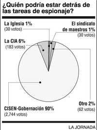 Aunque las autoridades lo niegan el espionaje es una realidad en México, ha operado mucho tiempo. Pero, en el caso denunciado por los senadores Manlio Fabio Beltrones y Ricardo Monreal, ¿quién lo ejecutó? El 90 por ciento de 3 mil 49 personas de toda la República que encuestamos esta semana señala al Cisen. Otro 6 por ciento sospecha de la CIA. Un porcentaje menor responsabiliza al sindicato de maestros, a la Iglesia y otras organizaciones.