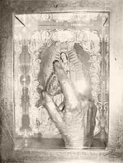 Carmen Parra realizó tres exquisitas acuarelas de 21cm x 11cm decoradas con hoja de oro de 23 kilates, en tonalidades rojas y sepias que hacen alusión a imágenes de la Catedral. Son una recreación libre de los grabados hallados en la caja recién descubierta, en los que aparecen la Virgen de Guadalupe, Patrona de nuestro pueblo, San Miguel Arcángel, brazo de Dios que combate el mal, y Santa Bárbara, protectora contra los relámpagos y patrona de arquitectos y canteros. En la imagen que acompaña este texto, vemos una segunda versión de la Virgen en la que Carmen incluye una talla que representa su propia mano pintando la obra: “Con mis acuarelas estaré en el viaje de la eternidad y en unos siglos que se abra esta caja seremos nosotros el testimonio de esta época. Podemos decir que cada obra de arte es una caja del tiempo que contiene su propio tiempo.”