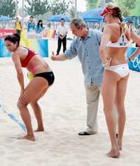 El presidente George W. Bush saluda a Misty May-Treanor con un golpe en la espalda, una costumbre habitual en en el volibol de playa, ante la presencia de Kerri Walsh que completa el equipo de Estados Unidos