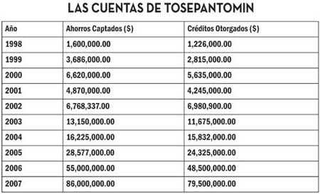 Desde el principio la Tosepantomin se dedicó a captar ahorros para ofrecerlos como créditos, tanto a sus socios como a los distintos programas de trabajo de la Tosepan. Ha sido preocupación constante adaptar los servicios y productos financieros a las necesidades de la población. En la actualidad ofrece cinco productos de ahorro (infantil, jubilación, compromisos y festividades, inversión y cuenta corriente) y cuatro de crédito (productivo, vivienda, credimujer y emergencia). Además se otorgan los servicios de seguros de vida y pago de remesas. El cuadro estadístico muestra cómo han evolucionado los montos de ahorro y de crédito en los diez años de existencia de la Tosepantomin. En abril de 2001 fue aprobada la Ley de Ahorro y Crédito Popular por las cámaras de Diputados y de Senadores y promulgada el 4 de junio del mismo año. El fin primordial de esta ley es proteger y asegurar el ahorro de los mexicanos, además de promover el desarrollo ordenado del sector financiero de ahorro y crédito popular. En ella se establece que los intermediarios financieros que deseen seguir captando ahorros, solamente podrán hacerlo si se transforman en sociedades cooperativas de ahorro y préstamo o en sociedades financieras populares. Para ello deben ser dictaminadas favorablemente por una federación y autorizadas por la Comisión Nacional Bancaria y de Valores. Entre los retos que le trajo el nuevo escenario nacional a la Tosepantomin están los siguientes: la necesidad de profesionalizar sus estructuras administrativas; el uso de mejores tecnologías de información, comunicación y de administración; una mayor capacitación para su personal directivo y de operación, y el aumento de costos derivado de la supervisión. Para enfrentar estos desafíos, la Tosepantomin ha diseñado una imagen corporativa propia; ha elaborado sus propios manuales de operación y procedimientos; ha brindado capacitación a sus directivos y a todo el personal operativo; ha instalado un sistema informático automatizado, y ha extendido su área de atención a 15 municipios, por medio de tres sucursales y seis kaltomineualoyan (lugar donde se guarda dinero, en náhuatl) en las comunidades más alejadas para atender desde ahí a sus socios.