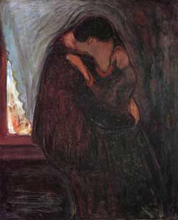 ¿Qué es un beso? Un simple intercambio de salivas, escribiría E. M. Cioran en un de sus despiadados aforismos. Y si Edvard hubiera podido leer tan extravagante definición, sin duda habría asentido de inmediato, previa sonrisa irónica. Pero, ya sea en esta tela o en los grabados sobre el mismo tema, el beso significa para él algo más hondo y dramático que el simple acto de succionar la saliva ajena. Un hombre y una mujer se funden en un trémulo abrazo. De sus pesados cuerpos –asemejando una inmensa montaña escarpada– emergen vibraciones incesantes, ondas verdes y azulosas que se expanden hacia el exterior del cuarto, como si huyeran despavoridas a través de la ventana que está al fondo de la habitación. La mañana transcurre desapacible y el intenso frío los acosa sin clemencia. Una luz blancuzca e indiscreta se filtra y expande por el costado inferior del cuadro. Los aludidos visten de negro, el color de la culpa y el temor. Advertimos el perfil derecho, difuso y sin mácula, del propio Munch, una imagen resuelta con pocos y efectivos trazos capaces de delinear su archiconocido autorretrato simbólico. De ella sólo vemos el cuello y una porción incierta, difuminada, de su rostro. ¿Rehuye o responde al contacto de los labios? He aquí la incógnita. Más que erotismo hay en ese sujeto un deseo irrefrenable de posesión, de sometimiento; la excitación sexual parece desbordársele con apremio. La mujer, en actitud pasiva, no se resiste al abrazo, acepta las reglas del juego y hasta apoya cálida y tímidamente sus dos manos sobre aquella espalda encorvada, henchida de pulsiones a punto de estallar. Al entrelazarse de esta manera, ambos cumplen el convenio previamente establecido. No se vislumbra en la escena ninguna chispa de calidez amorosa, sólo la consabida acción de toma y daca que ocurre todos los días y en todas partes. Tampoco se percibe un dejo pasional, ni siquiera un atisbo de afecto, sólo las típicas emociones incontroladas y volátiles aprendidas rutinariamente a lo largo de los siglos. La solícita aquiescencia de ella nos impacta, nos retrotrae a ese ancestral ritual mediante el cual se atestigua el frío trueque del placer por su precio en oro. ¿Corolario? Un gélido beso, dos soledades compartidas y la ilusión transfigurándose en evasión. Una y mil veces.