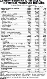 De los ingresos tributarios, el impuesto sobre la renta (ISR) captó 309 mil millones en el primer semestre, 6.9% más que en 2007, pero apenas una tercera parte de lo que debería captar, de acuerdo con la recaudación promedio por este impuesto de la Organización para la Cooperación y el Desarrollo Económicos (OCDE). El impuesto “alterno” que inventó Hacienda, el empresarial a tasa única (IETU) sólo captó 28 mil millones, y en los cuadros aparece con “ns”, no significativo, calificación que lo define claramente (Gráfico 2).
