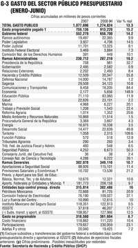 En una presentación distinta del ingreso (1.363 billones de pesos) (Gráfico 2) se apunta que el gobierno federal captó 1.076 billones (21.6% más que en 2007) y que los organismos y empresas aportaron 287 mil millones (-20.6% abajo que en 2007, básicamente por el caso de Pemex).