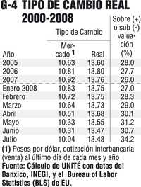 Tipo de cambio.- En sus intentos por contener la inflación, el Banco de México ha favorecido/permitido una nueva sobrevaluación acelerada del peso de, según nuestros cálculos, 26% en diciembre pasado, a 34.2% al cierre de julio, esto es, una paridad de 10.04 pesos por dólar en el mercado frente a un tipo de cambio real de casi 13.50 pesos por dólar (Gráfico 4).