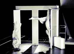 La estupenda escenografía de Benjamín Urtiz consiste en un cubo cuyas paredes y techo se abren y cierran, además de que cuenta con dos puertas y una ventana, con lo cual se va transformando el espacio hogareño en que se desarrolla la obra. La iluminación de Francisco Muñoz está en total concordancia con la propuesta escenográfica y logra las atmósferas adecuadas. El uso de la multimedia a cargo de Arturo Marruenda, quien es también el compositor musical, merece una mención especial, ya que es apenas la segunda vez que, en mi experiencia de espectador de danza, el video no es solamente un elemento accesorio y decorativo al que se recurre porque está de moda o porque, ilusoriamente, implica estar tecnológicamente acorde con los tiempos, sino que se integra realmente al espectáculo como significante e interviene en la dramaturgia; momentos memorables, entre varios, son los que se logran cuando el hijo acaricia una de las puertas y aparece una mancha de color que luego desaparece, o cuando se proyecta en una maleta lo que viene al interior, que es el propio personaje, simbolizando así la experiencia con que se carga a pesar de la distancia. Es imposible saber desde dónde se proyecta el video; supongo, en mi ignorancia en cuestiones de este tipo, que se trata de un nuevo programa de computadora que, si llega a manos de otros artistas escénicos interesados en este recurso, lo estaremos viendo aplicado con mucha frecuencia en el futuro.