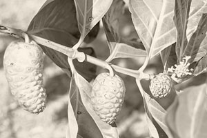 El noni (Morinda Citrifolia) es un arbusto recubierto de corteza verde brillante y hojas elípticas. Florece a lo largo de todo el año, su fruto contiene muchas semillas. Cuando madura, posee un olor penetrante FOTO: Christoph Diewald |