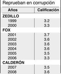 Los ocho años que el PAN ha estado en el timón del gobierno han sido de corrupción, de acuerdo a Transparencia Internacional, una entidad privada que califica el desempeño de 180 naciones. Comenzó a darle seguimiento a México en los años postreros del priísmo, el entonces presidente Zedillo tampoco aprobó. Una de las armas favoritas de Vicente Fox para atacar al viejo régimen fue su descomposición moral. Con la promesa de cambio, al llegar a Los Pinos se comprometió a disminuir la enfermedad a nivel estándar, como Francia o Japón, no se trataba de convertir a México en un templo de probidad como Dinamarca o Suecia. Sin embargo, pronto se olvidó de la promesa y los seis años tuvo notas reprobatorias de Transparencia. El presidente de las “manos limpias”, Felipe Calderón, no canta mal las rancheras. No pasó su primer año y ayer llegó de Europa la calificación correspondiente a 2008: ¡volvieron a ponerle orejas de burro! La boleta va de cero a 10 puntos, el gobierno nunca ha podido alcanzar 4. En esta página aparece el registro de calificaciones de los últimos tres presidentes.