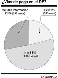 El gobierno de la ciudad de México anuncia la construcción de túneles y supervías que tendrán la finalidad de agilizar el tránsito de la congestionada vida capitalina. Algunas serán de paga. ¿Te parece buena idea? Es decir: ¿estás de acuerdo con el nuevo cargo a tu presupuesto? Tal fue el tema de la encuesta que hicimos esta semana, en la que 51 por ciento rechaza la idea de pagar peaje, 21 por ciento lo acepta y 28 por ciento expresó que le falta información.