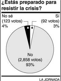 Noventa y tres por ciento de 3 mil 73 personas que participaron en la encuesta de esta semana no creen estar preparadas para enfrentar la crisis económica que ha alcanzado a México. Tres por ciento es optimista, dice que superará el escollo y 4 por ciento no sabe qué sucederá.
