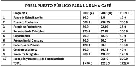 Buscan más para 2009. Para el 2009, nuevamente el Consejo de Organizaciones presenta una propuesta de presupuesto que implica un aumento de 10 por ciento real respecto a 2008, y se plantea que 63 por ciento sea para mejorar la producción tanto en las labores anuales como en Renovación de Cafetales. Se da prioridad con un aumento significativo a Fomento Productivo, considerando que sea un mecanismo parcialmente compensatorio al ingreso de los productores que ha sido afectado por la sobrevaluación del peso. No se conoce la propuesta para café que presenta la Sagarpa ; el Consejo asistirá a la Cámara de Diputados y lo más seguro es que se apruebe buena parte de su propuesta, pero nuevamente en el 2009 se perfila una negociación accidentada con la Sagarpa : un cuento de nunca acabar. Algunas cuestiones centrales para un mejor uso del presupuesto de café de 2009 son: 1. Deben modificarse las reglas de operación de la Sagarpa y que se permita manejar el presupuesto para café como un proyecto integral con lineamientos específicos por programa. El manejo debe ser a partir de una estrategia con objetivos y metas claras de la rama cafetalera. 2. Es necesario eliminar la figura del Coten y que se establezca una relación de mayor coordinación entre la Sagarpa y sus áreas con el SPC y su figura jurídica, la AMECAFÉ. Debe respetarse la autonomía de estas instancias. 3. Es importante que la Sagarpa y el gobierno federal reconozcan el efecto negativo de la fuerte sobrevaluación del peso en los precios internos del café. Por ello es necesario que se aumente el monto por hectárea para Fomento Productivo. 4. Los productores deben hacer un esfuerzo y mejorar la productividad y la calidad de su café, así como aumentar su comercialización vendiendo directamente en mercados de mayores precios como los de Alta Calidad, Origen, Orgánicos Comercio Justo. Deben demostrar que hacen un buen uso de los subsidios. Asesor de la Coordinadora Nacional de Organizaciones Cafetaleras (CNOC) y miembro del CNOPC Forestal Indispensable, enfocar recursos a la gestión de los bosques Iván Zúñiga