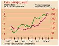Aun así, el que esta crisis no tenga el sello “made in América Latina” es motivo de modesta celebración. Durante las crisis de 1994, 1998 y 2000, América Latina utilizó el financiamiento extranjero para pagar el enorme incremento de las importaciones. El estado de ánimo cambió, el dinero extranjero huyó y surgió el pánico. Esta vez, muchos países han tenido excedentes comerciales en años recientes, y el aumento de precios en materias primas ha dado una apariencia más respetable a las finanzas gubernamentales (ver gráfica).