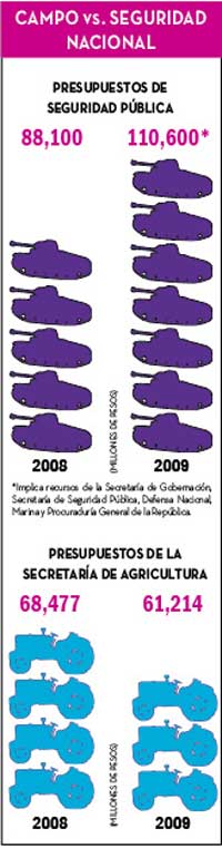 Más dinero, más política neoliberal para el campo. A contrapelo de las iniciativas presidenciales, que reiteradamente proponen magros recursos fiscales para el sector rural, las organizaciones han logrado que la Cámara de Diputados apruebe año con año mayores recursos para el campo. Así, el presupuesto del Programa Especial Concurrente para el Desarrollo Rural (PEC) se incrementó de 120 mil millones de pesos en 2004 a 204 mil millones en 2008, o sea en 14 por ciento nominal en promedio anual. El presupuesto particular de la Secretaría de Agricultura (Sagarpa) creció en términos nominales en 22.3 por ciento por año, de 25 mil millones en 2002 a 64 mil millones de pesos en 2008. No obstante, se observa mayor desigualdad social en el campo, mayor dependencia alimentaria, estancamiento de la economía rural, mayor migración, mayor valor en las importaciones de alimentos, mayor déficit en la balanza comercial agroalimentaria, mayor deterioro en la situación alimentaria de los mexicanos y mayor depredación de los recursos naturales; en suma, a mayor presupuesto, se ha intensificado la política neoliberal en el campo. ¿Qué está fallando? La orientación de la política gubernamental subyacente en el PEC no ha sido modificada por las organizaciones campesinas ni por la Cámara de Diputados, y prevalece el autoritarismo y la ineficacia en el ejercicio presupuestal a cargo de Ejecutivo federal. Disfuncionalidad gubernamental. El PEC, con más recursos cada año, sistemáticamente se subejerce, se canaliza con total inoportunidad, con absoluta discrecionalidad e incertidumbre, prevaleciendo la concentración de subsidios en los agricultores ricos, en los agroempresarios y en las zonas agrícolas desarrolladas del norte. Estos hechos reiteran que las dependencias y agencias gubernamentales encargadas del ejercicio del PEC están burocratizadas en extremo, desvinculadas de la realidad del sector y de las necesidades e iniciativas de la sociedad rural. Se trata de un gobierno disfuncional, centrado en sí mismo y cooptado por las distintas mafias burocráticas, los diferentes grupos políticos del partido en el poder y, sobre todo, por la cúpula agroempresarial. Botín político. A falta de una política pública sectorial con base en los mandatos constitucionales, el consenso con la sociedad rural y la legitimidad y credibilidad del Ejecutivo federal, el presupuesto rural se ha convertido en un botín en disputa que impide sistemáticamente que sea un instrumento efectivo para el cumplimiento de la Constitución y de la Ley de Desarrollo Rural Sustentable. En la disputa entran el gobierno federal, los gobernadores, las cúpulas agroempresariales, las centrales campesinas, los diputados y senadores, los presidentes municipales, los monopolios agroalimentarios, etcétera. Todo mundo quiere sacar su parte, en función de sus intereses particulares, gremiales, de corto plazo. Además, crecientemente y de manera desbordada el presupuesto rural es utilizado por el gobierno federal, los gobiernos estatales, los presidentes municipales, los legisladores y las organizaciones rurales de viejo tipo para fines político-electorales, clientelares y corporativos. De tal forma que no hay presupuesto para el campo que alcance y que sirva para revertir la desigualdad, el estancamiento económico, el atraso, la pobreza, la malnutrición, la dependencia e inseguridad alimentaras. Lo anterior, sobre todo a partir de la guerra sucia desatada por el gobierno de Fox y el PAN que condujo al fraude electoral en las elecciones presidenciales de 2006. Ahora, todo se vale, no hay límites, no hay contrapesos y prevalece la impunidad absoluta en el mal manejo del presupuesto rural. Presupuesto rural y asistencialismo. Mayores recursos al PEC pero enfocados en una política asistencialista para la mayoría y de desarrollo productivo para la minoría. El PEC no tiene un enfoque de desarrollo productivo, y por tanto no se privilegian las inversiones públicas estratégicas para el sector ni el acceso universal al crédito con tasas preferenciales ni a los activos productivos para los pequeños y medianos productores, base de cualquier política de superación de la actual crisis alimentaria. Asimismo, hay una negativa sistemática en el PEC a reconocer el carácter de sujetos de la política sectorial a las organizaciones autónomas de productores, sujetos agrarios y pobladores rurales. Se les continúa considerando como objetos pasivos, dependientes de la filantropía pública y privada, y como clientela político-electoral. Se privilegia, en cambio, a los despachos privados –la nueva plaga del campo– vinculados a los funcionarios y autoridades así como a los agricultores ricos y a las mega corporaciones agroalimentarias.