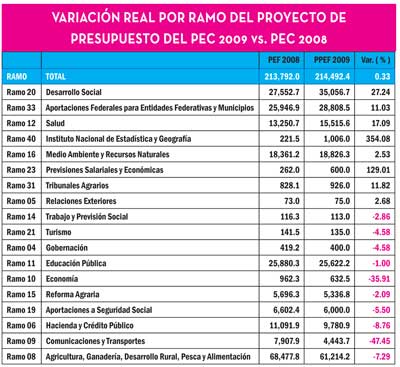 Por un presupuesto rural de oposición para 2009. Se requiere aprender de las experiencias. El problema central NO está en el monto del presupuesto, sino en la orientación de la política subyacente y los mandatos vinculatorios para el Ejecutivo federal desde el DPEF. Ésta ha sido la posición de las organizaciones económicas campesinas desde hace años. Se trata, en primer lugar, de acotar al máximo la discrecionalidad y el autoritarismo del Ejecutivo para que prevalezca el mandato programático-presupuestal de la Cámara de Diputados. En segundo lugar, de correlacionar directamente el presupuesto rural con los objetivos y las metas de una nueva política agroalimentaria y de desarrollo rural que sea capaz de enfrentar la crisis alimentaria y la económica-financiera del país y del sector. En tercer lugar, se trata de establecer mandatos desde el DPEF para un ejercicio oportuno, conforme a reglas públicas y calendarios de operación y desembolso oportunos, con mecanismos que aseguren transparencia y rendición de cuentas. Y en cuarto lugar, se requiere establecer mandatos para una reforma institucional radical a efecto de superar el estado actual de disfuncionalidad. Para esto se requiere de un bloque unitario de fuerzas campesinas, que se apegue a los compromisos del Manifiesto Campesino del 31 de enero de 2008, y que se capaz de impulsar y presionar la conformación de un bloque parlamentario de oposición (PRI, PRD, PT, Convergencia) en la Cámara de Diputados que reoriente radicalmente y apruebe otro PEC 2009. No más de lo mismo. Otro presupuesto rural es posible. Director de la Asociación Nacional de Empresas Comercializadoras de Productores del Campo (ANEC)