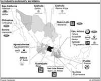 Incluso este ramo de la industria manufacturera es el motor de la economía en entidades como Saltillo y Ramos Arizpe, Coahuila; Mexicali, Baja California; Chihuahua; Hermosillo, Sonora; Monterrey, Nuevo León; Cuernavaca, Morelos; Silao, Guanajuato; San Luis Potosí; Puebla, Aguascalientes; Toluca, Cuautitlán, Lerma y Santiago Tianguistenco en el estado de México; y El Salto, Jalisco; donde operan plantas de Ford, Chrysler, General Motors, Honda, Toyota, Nissan, Renault, BMW y Volkswagen.