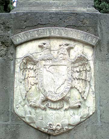 Primer escudo tallado en marmol de la Universidad Nacional de México, en la sede de la Escuela Preparatoria en 1929, en el Centro Histórico de la ciudad de México. Foto: Francisco García Noriega
