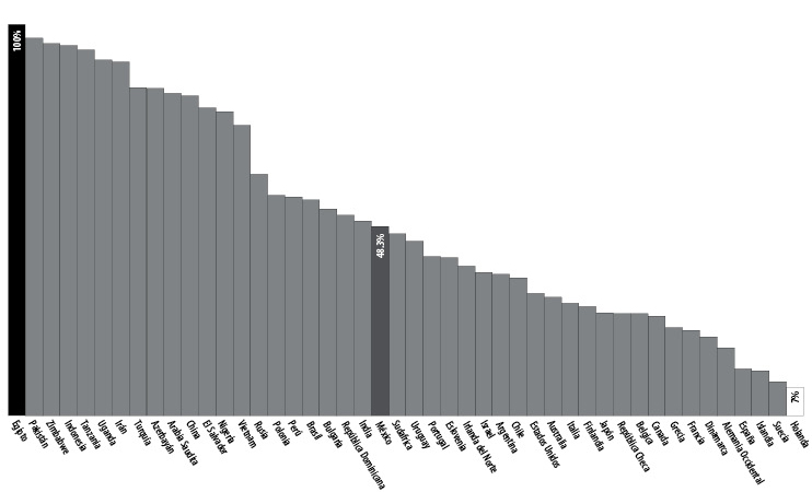 El lugar de México en este ranking mundial de la homofobia es intermedio: 48.3 por ciento de los mexicanos opinan que la homosexualidad nunca es justificable y a 44.6 por ciento no le gustaría tener como vecino a un homosexual. Es interesante notar que otros países de la región con desarrollo económico similar tienen frecuencia más baja de homofobia, como Chile y Argentina.