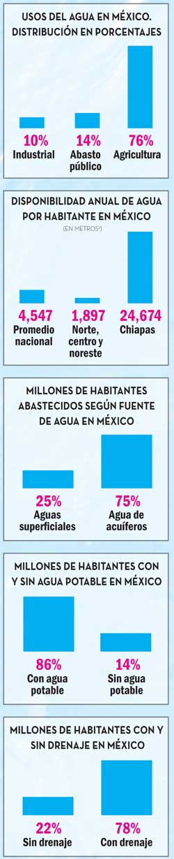 De los 21 millones de hectáreas cultivables, la mayor parte (14.5 millones) depende del temporal. Pero los 6.5 millones de hectáreas irrigadas aportan 55 por ciento de nuestra producción agrícola y se ubican principalmente en el norte, donde también imperan los agronegocios exportadores de granos, leguminosas y hortalizas. Sin embargo, por la obsoleta infraestructura hidroagrícola se pierde entre 30 y 50 por ciento del agua de riego. En el sur, en cambio, predomina la producción campesina de temporal o con sistemas de riego rústicos. Aunque la industria es la que menos agua consume, genera tanta contaminación como la de todos los mexicanos juntos. Además también aquí se dilapida el recurso, pues de ser mayor el reciclamiento se reduciría el consumo entre 40 y 80 por ciento. Empleo doméstico. Al abasto público se destina 14 por ciento del líquido disponible, pero todavía hay 14 millones de personas sin agua entubada y 22 millones sin alcantarillado. Y al campo le va peor, pues ahí el 32 por ciento de las familias carece de agua potable y el 63 por ciento de alcantarillado. Y la polarización respecto del agua no es sólo entre el México urbano y el rural, también hay fuertes desigualdades por niveles de ingreso. Otro problema es que en zonas pobres el agua se suministra de manera discontinua, por tandeo, y en el agro es peor. Así, mientras que 47 por ciento de las viviendas urbanas recibe suministro diariamente, en el campo sólo lo reciben tres de cada 10 familias. A esto hay que agregar que 27 por ciento de hogares carece de agua dentro de la vivienda. Cobertura y tarifas. Por varios motivos la cobertura de agua potable y saneamiento no ha crecido ni mejorado: tarifas que no pagan los costos, ineficiencia, mala operación, corrupción y uso político del suministro. Los municipios, a los cuales desde 1983 se les transfirió la prestación del servicio, se quejan de falta de financiamiento y recursos para cumplir sus funciones. En Chiapas, la región hidrológica más importante del país, menos de 50 por ciento de la población puede abastecerse de agua potable, por el alto costo que significa llevarla a la sierra y Los Altos, donde se ubican cientos de comunidades indígenas con el mayor índice de marginalidad y pobreza. ¿Derecho humano o mercancía? A fines de los 80s comienza a cambiar el modo de regular la distribución y el manejo del agua, hasta entonces basado en una fuerte intervención estatal. En 1989 se crea la Comisión Nacional del Agua, órgano desconcentrado de la entonces llamada Secretaría de Agricultura y Recursos Hidráulicos, que impulsa la participación privada en la operación de los servicios, lo que se profundiza en 1992 con la aprobación de la Ley de Aguas Nacionales. En 1996, en 29 de 32 entidades del país, hay legislaciones que autorizan la participación de capitales privados en el manejo del agua mediante contratos de servicios. Desde entonces y por periodos de hasta 50 años, se otorgan concesiones a particulares para la administración parcial o total de los sistemas de agua, así como para el financiamiento, construcción y operación de plantas de tratamiento o de infraestructura hidráulica.