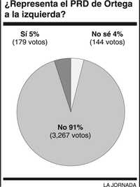 ¿Representa el PRD, en su nueva etapa, a la izquierda mexicana? De 3 mil 590 personas que participaron en la encuesta de esta semana, 91 por ciento no identifica al PRD de Jesús Ortega como representante de la doctrina y las aspiraciones de la izquierda, 5 por ciento opina lo opuesto y 4 por ciento no tiene una idea clara.