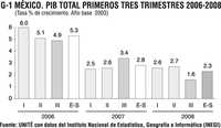 Vistos los tres primeros trimestres del año en conjunto, el PIB total muestra un crecimiento anualizado de 2.3% respecto de enero-septiembre de 2007, y por actividades, el PIB agropecuario un crecimiento de 3.2%, el industrial de 0.4 y el de servicios de 3.2% (Gráfico 2). En el periodo, el PIB anualizado se ubicó en 12 billones 42 mil 480 millones de pesos.