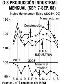 En el caso de la producción industrial total, las dos grandes inflexiones a la baja de los pasados 12 meses (sep.-sep.) se registran: la primera en el cuarto trimestre de 2007, y la segunda, tras una relativa recuperación, a partir de junio de este año, cuando empieza la caída de la producción manufacturera y de la construcción, y a partir de agosto en el caso de la producción petrolera (Gráfico 3).