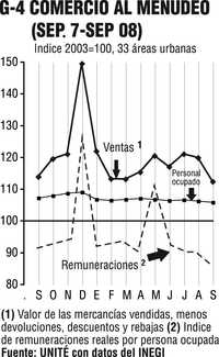 El indicador de ventas al con-sumidor (comercio al menudeo), muestra que, tras el pico de fin de año, éstas tuvieron una relativa recuperación a lo largo del primer semestre e iniciaron una inflexión a la baja a partir de julio (Gráfico 4). La ocupación en este sector se observa en lo general estable, aunque ligeramente declinante: con un índice (2003=100) de 107.3 en septiembre de 2007; de 109.1 en diciembre, y de 105.9 en septiembre de este año.