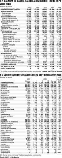 Dicho déficit en la CC fue 17.4% mayor al de enero-septiembre de 2007 (Gráfico 2) y el más elevado en los últimos siete años, y fue resultante de los déficits en las balanzas: Comercial (-8 mil 381 millones), de Servicios no factoriales (-5 mil 127 millones) y de Servicios factoriales (-14 mil 789 millones), parcialmente compensados por el superávit en Transferencias por 17 mil 843 millones de dólares (Gráfico 1).