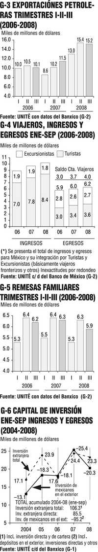 Remesas familiares.- El flujo de remesas enviadas por los emigrantes ha sido menor a 2007 en cada uno de los tres trimestres de este año (Gráfico 5); en los nueve meses el ingreso por este concepto fue de 17 mil 526 millones, -3.7% abajo de 2008; y en el tercer trimestre exclusivamente, el monto fue de 5 mil 925 millones, -6.5% inferior que en el tercero de 2007.