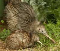 Una hembra kiwi acompaña a un polluelo en un centro de recuperación para las aves nativas en Whangarei, Nueva Zelanda, donde el gobierno libra una feroz batalla para proteger esta especie endémica ante la plagas de ratas, perros, hurones y tlacuaches que prácticamente han arrasado con estos pájaros
