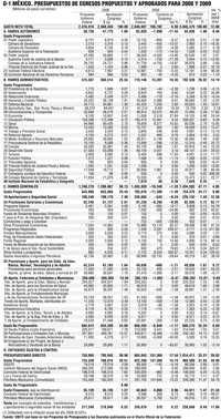 El Presupuesto de Egresos aprobado para 2009 por la Cámara de Diputados asciende a un total de 3 billones 45 mil 479 millones de pesos, cifra que a precios nominales (corrientes) es 18.5% superior a la aprobada para 2008 (2.569 billones), y a precios constantes (quitando la inflación que en 2008 fue de 6.53%) representa un incremento real del 12% (Gráfico 1).
