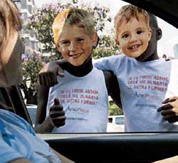 Campaña contra el racismo en calles de Río de Janeiro; niños negros portando máscaras de niños blancos y con una camiseta donde se lee: Si fuera asi, ¿me verías de otra forma? |