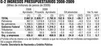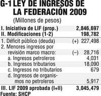En el proyecto de Ley de Ingresos para 2009 enviado por el Ejecutivo al Congreso en septiembre pasado, la propuesta de ingresos ascendía a un total de 2.847 billones de pesos, monto al que se hicieron múltiples modificaciones cuyo saldo neto fue una adición de 199 mil millones, con lo que finalmente fue aprobado un total de ingresos por 3 mil 45 billones de pesos para el sector público federal (Gráfico 1).