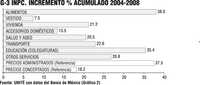 En un acumulado del último quinquenio (2004-2008) se ob-servan los fuertes aumentos de los alimentos (38.0%) y la edu-cación privada (35.4%); tambi-én en los precios administrados (37.5%) (Gráfico 3).