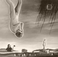 A lo largo de su quehacer artístico, Monroy ha destacado como un pintor religioso postmoderno de una profunda espiritualidad. El hilo conductor que hilvana su trabajo es precisamente su cuestionamiento existencial en torno a la postura del ser humano en la modernidad: la fe o pérdida de la fe, la desolación, la incomunicación, la barbarie… En sus lienzos se palpa el desencanto por la condición humana que ha hecho hasta lo impensable para autodestruirse y acabar con el entorno natural. De ahí que desde hace muchos años uno de los temas predilectos y recurrentes en su repertorio iconográfico ha sido la representación de la Expulsión del paraíso, imagen que retoma del magnífico fresco que pintó Masaccio en 1427 en la Capilla Brancacci de la iglesia del Carmen en Florencia. Bajo este título –Expulsión del paraíso– se presenta otra exposición del artista en la Galería Luis Cardoza y Aragón de la Librería Rosario Castellanos del Fondo de Cultura Económica (Tamaulipas 202, Col. Condesa), que reúne nueve telas y una escultura fechados entre 2004 y 2005.